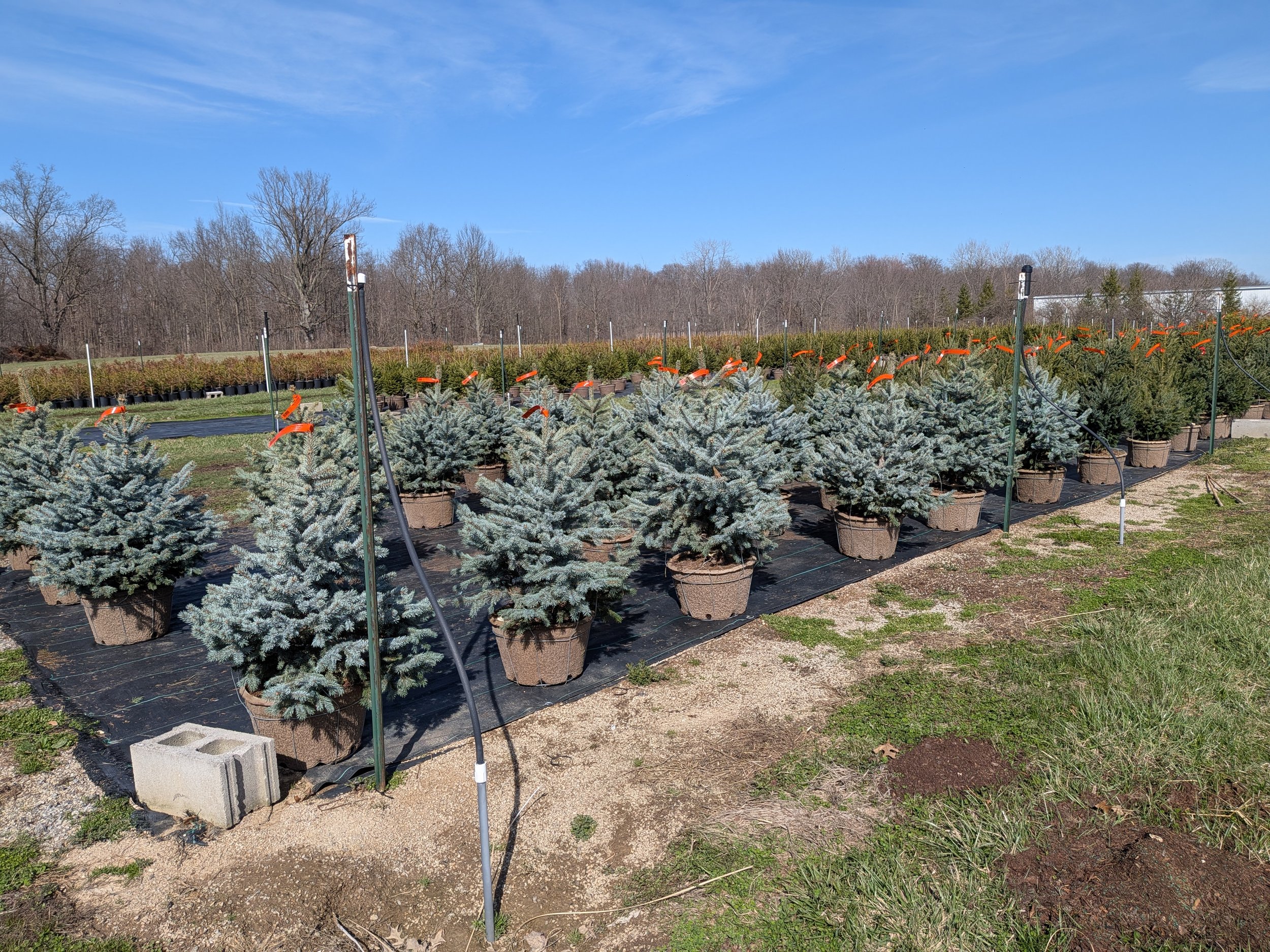 The picture shows an example of wind break on our property. We planted two rows of Norway Spruce that in the picture are 10 years old. They were planted as a 2 ft potted tree. The Norway Spruce keep their shape very nicely and are a fast grower, which makes them a great choice for windbreaks or privacy screens.
